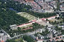 The garden was designed in 1697 in Baroque style by Simeon Godeau, who had been influenced by André Le Nôtre, designer of the gardens at Versailles. Godeau's design consisted of geometric patterns, with avenues and moats, which separated the garden from its natural surroundings. Beyond the formal gardens was the Carp Pond. Towards the end of the 18th century, a less formal, more natural-looking garden design became fashionable. In 1787, the royal gardener Georg Steiner redesigned the garden in the English landscape style for Friedrich Wilhelm II, the work being directed by Peter Joseph Lenné. After the Second World War, the centre of the garden was restored to its previous Baroque style.[11]