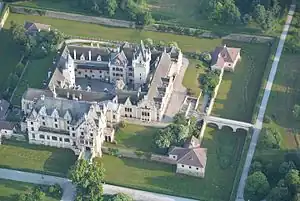 These parts were not redesigned until 1887-1888, with the outside front on the east going back to the 16th century essentially unchanged, with the exception of the projecting chancel of the castle chapel. The garden hall was built by Hugo Ernst in the south-east corner, while the three-room library in the east wing was redesigned in baroque revival style.