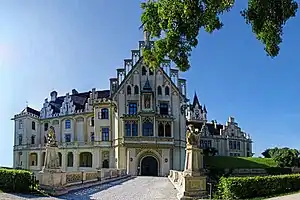 On the west side of the castle, there is a monumental loggia, which was completed in 1863. A few years later, it was decorated with cheerful ceiling paintings and grotesque console figurines. The main tower from 1861 is crowned with so-called bartizans. It is located in front of the west wing towards the castle courtyard. It forms a strong contrast to the slender late Gothic tower opposite on the east side of the castle courtyard.