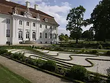 Following the reunification of Germany the estate was bought by the Messerschmitt Foundation in 1995. The foundation, devoted to preserving historical landmarks, spent 11 years and more than $30 million renovating the stucco building, with its Ionic half-columns and high mansard roof.[2][1]