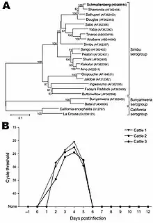 - ↑ Goller KV, Höper D, Schirrmeier H, Mettenleiter TC, Beer M (October 2012). "Schmallenberg virus as possible ancestor of Shamonda virus". Emerg Infect Dis. 18 (10): 1644–1646. doi:10.3201/eid1810.120835. PMC 3471646. PMID 23017842.