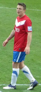 He was voted the Professional Footballers' Association Fans' Player of the Month for September 2006.[16] Brown joined fellow League One club Cheltenham Town in January 2007.[17] He broke his leg in a collision with teammate Damian Spencer in a match against his former team[18] and was ruled out for the rest of the 2006–07 season.[19] His full recovery from the double leg fracture and dislocated ankle took a total of 18 months despite the surgeon initially fearing that Brown would struggle to ever walk properly again.[20] Despite having left Bristol City halfway through the 2006–07 season he was presented with a promotion medal by Gary Johnson for his contribution in the first half of the campaign.[16]
