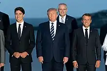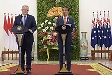 Morrison won a second term after leading the Coalition to an upset victory in the 2019 election.[3] Morrison drew near unanimous condemnation for taking a holiday during Australia's 2019–20 bushfire season and for his government's response to the disaster.[4] Morrison also faced criticism for his response to the 2021 Parliament sexual misconduct allegations.[5] During the COVID-19 pandemic, Morrison established the National Cabinet, and Australia received praise during 2020 for being one of the few Western countries to successfully suppress the virus,[6] though the slow initial pace of the COVID-19 vaccination rollout was criticised.[7] In foreign policy, Morrison oversaw the signing of the AUKUS security pact and increased tensions between Australia and China[8] and Australia and France.[9] Morrison directed logistical support to Ukraine as part of the international effort against Russia in the wake of the 2022 Russian invasion of Ukraine. Morrison has also been criticised for his government's response to the 2022 eastern Australia floods,[10][11][12] and his perceived inaction on climate change.[13][14] The government was defeated at the 2022 election and Morrison stepped down as leader of the Liberal Party; Peter Dutton was elected unopposed to replace him.[15][16]