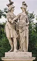 29 | Janus and Bellona | Johann Wilhelm Beyer | Janus was the god of gates, doorways, and beginnings in the Roman religion. He is often depicted having two faces because he looked to both the past and the future.[11] The first month of the Roman calendar (Ianuarius or January) was named in his honor.[11] Janus is shown standing with Bellona, the Roman goddess of war, and according to various accounts the wife or sister of Mars.[36] The first temple dedicated to her was built in the Campus Martius near the Circus Flaminius by Appius Claudius Caecus in 296 BC during the war against the Etruscans.[36] | ![]() |
