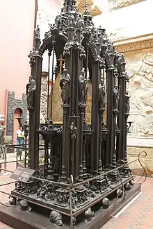 Despite the obscure origins and insecure historicity of the saint himself, the cult of Sebaldus has been long associated with Nuremberg, fostered by the city itself, which became a place of pilgrimage.[5] The earliest existence of his cult can be dated to the late eleventh century, with a passing reference under the year 1072 in the chronicle of Lambert of Hersfeld.[6] in 1255, he became the co-patron, with Saint Peter, of the newly rebuilt parochial church, where his tomb was venerated.[5]