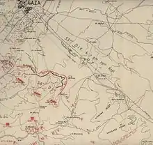 All of the Desert Column mounted and infantry divisions had fought during the first battle of Gaza, when the column's 53rd (Welsh) Division had been heavily involved.[6] This "encounter battle" by the mounted divisions emphasised speed and surprise,[7] at a time when Gaza had been an outpost garrisoned by a strong detachment on the flank of a line stretching inland from the Mediterranean Sea.[8]