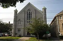Second Tompkins County Courthouse, also known as Old Courthouse, is a historic courthouse located at 121 E. Court Street in Ithaca in Tompkins County, New York. It is a two-story, 57 feet by 75 feet rectangular building with a three-story tower. The building is built of red brick, covered with stucco, over a stone foundation. The tower contains a belfry with a pointed arch opening on each of the four sides. It was built in 1854 and has a notable open timber roof.[2]