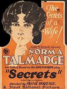 Secrets is a 1924 American silent drama film directed by Frank Borzage. The film is based upon a 1922 play of the same name, and was remade in 1933 with Mary Pickford in the leading role.[3] Although the film was never released on video or DVD, copies still exist.