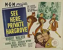 See Here, Private Hargrove is a 1944 black-and-white comedy film from MGM, produced by George Haight, directed by Wesley Ruggles, and starring Robert Walker, Donna Reed, and Keenan Wynn. The film was adapted from the 1942 memoir of the same name by Marion Hargrove.