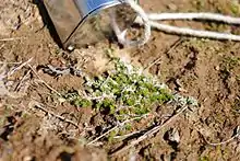 Selaginella cinerascens is a species of spikemoss known by the common names mesa spikemoss,[4] gray spikemoss, and ashy spikemoss. It is native to Baja California as well as some locations just north of the border in San Diego County, California. It grows in dry habitat, often on clay soil, both in open areas and in the shade of larger plants. This lycophyte forms mats of spreading, forking stems up to 18 centimeters long. The plant is often gray or brown in color, forming a dull-colored carpet on the substrate. The linear or lance-shaped leaves are 1 to 3 millimeters long and lack bristles at the tips. The leaves are green when new or moist. They are flattened to the stem or stick out just a little. The strobili borne at the leaf bases are yellow in color and no more than 4 to 5 millimeters long.