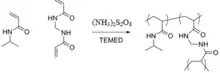 Radical polymerization | Radical polymerization is a method of chain growth polymerization. Chain-growth polymerization is one of the most common methods for synthesizing hydrogels. Both free-radical polymerization, and more recently, controlled-radical polymerization have been utilized for the preparation of self healing hydrogels. Free radical polymerization consists of initiation, propagation, and termination. After initiation, a free radical active site is generated which adds monomers in a chain link-like fashion.![]() A typical free-radical polymerization showing the formation of a poly(N-isopropyl acrylamide) hydrogel.