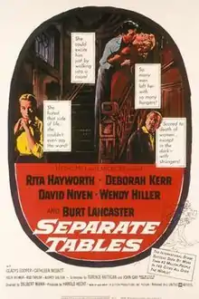Separate Tables is a 1958 American drama film starring Rita Hayworth, Deborah Kerr, David Niven, Burt Lancaster, and Wendy Hiller, based on two one-act plays by Terence Rattigan that were collectively known by this name. Niven and Hiller won Academy Awards for Best Actor and Best Supporting Actress respectively for their performances. The picture was directed by Delbert Mann and adapted for the screen by Rattigan, John Gay and an uncredited John Michael Hayes. Mary Grant and Edith Head designed the film's costumes.