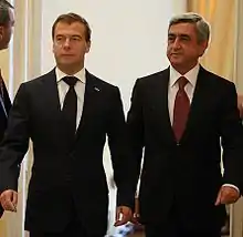 From 1993 to 1995 he served his first term as Armenia's Minister of Defense under President Levon Ter-Petrosyan.[1] In 1995 he became Minister of National Security of Armenia (initially called the State Security Department) and from 1996 to 1999 he concurrently served as Minister of Interior.[1] In February 1998, Sargsyan, along with then-Prime Minister Robert Kocharyan and Defense Minister Vazgen Sargsyan, forced President Ter-Petrosyan to resign in order to prevent him from accepting a peace plan for the Nagorno-Karabakh conflict put forward by international mediators in September 1997.[16] The proposal envisioned the return of most of the Armenian-occupied territories surrounding Nagorno-Karabakh to Azerbaijan in exchange for security guarantees, but left the final resolution of the status of Nagorno-Karabakh for future negotiations.[17] From 1999 to 2000 he served as the Chief of Staff for President Robert Kocharyan, and then served once again as the Defense Minister of Armenia from 2000 to 2007.[1] He was also the Secretary of the National Security Council led by President Kocharyan from 1999 to 2007.[1] On 4 April 2007 Sargsyan was appointed as the Prime Minister of Armenia, following the sudden death of Andranik Margaryan.[1]