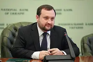 Serhiy Hennadiyovych Arbuzov (Ukrainian: Сергій Геннадійович Арбузов, Russian: Сергей Геннадьевич Арбузов, romanized: Sergey Gennadyevich Arbuzov; born 24 March 1976) is a Ukrainian former banker and politician who briefly served as acting Prime Minister of Ukraine from 28 January to 22 February 2014, following the resignation of Mykola Azarov amidst the escalating Euromaidan movement.[1][2] He previously served as First Vice Prime Minister of Ukraine from 24 December 2012 to 28 January 2014. On 27 February 2014, in the aftermath of the Revolution of Dignity, Arbuzov was dismissed, and Arseniy Yatsenyuk was elected as the new Prime Minister.