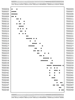 The data presented in this example was simulated by WinBasp. Initially 60 contexts (called units in WinBasp) were created along with 50 types. The contexts were labeled in chronological order by numbers 01 to 60, the types are labeled in the form T00001 to T00050. If a type is represented by one object only this object is not relevant for the chronological sequence as it does not provide a link to another context. Similarly, contexts containing one object only are irrelevant for seriation. Therefore, the contexts with one or no object and types represented by one object or not at all were eliminated. The resulting raw simulated data consisting of 43 contexts and 34 types are shown on the left. As expected, the dots indicating the occurrence of a type in a context are close to the diagonal of the table.