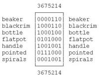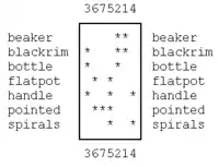 The raw data are stored in an unsorted binary contingency table indicating which design style can be found in which context by a star symbol. For example, consider the first column: context 3 contains the design styles blackrim, bottle, and handle. A beaker is contained in contexts 1 and 2. Contextual seriation sorts the design styles and the contexts in such a way that the star symbols are found as close as possible to the diagonal of the table. Of course, for a small examples like this, no computer programs are needed to find the best ordering, but for larger data sets like the 900 graves studied by Petrie they are extremely helpful.