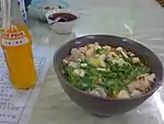 Gourd head | 葫蘆頭 | 葫芦头 | húlú tóu | ![]() | A dish made from pig's large intestine. It is called "gourd head" because the pig's large intestine looks like the top of a gourd. It originated as street food during the Northern Song dynasty. Since then, the dish has evolved to include variations with meat fillings inside the pig's large intestine, as well as the inclusion of other ingredients. Pictured with bottle of Ice Peak soda. |