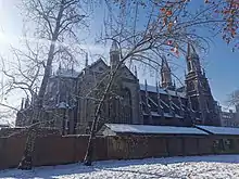 The earliest precursor institutions that would later be fused into Shandong University were founded by American and English mission agencies: In early January 1864, Calvin W. Mateer, an American Presbyterian missionary, and his wife Julia Brown Mateer, arrived in the recently opened treaty port of Dengzhou (Chinese: 登州; Wade–Giles: Tengchow) in the area of the present-day city of Penglai on the north-eastern coast of Shandong Peninsula.[11] Their journey had begun in New York on July 3, 1863, had taken them around the Cape of Good Hope to Shanghai, and had ended with a shipwreck off the coast of Yantai.[12] In the autumn of 1864, the Mateers opened an elementary school for boys (Mengyang Educational Society, Chinese: 蒙养学堂; pinyin: Méngyǎng Xuétáng) in a Guanyin temple that had been sold to them since there were insufficient funds for its upkeep as a temple.[11] The school's first class consisted of six boarders and two day pupils.[11] The school was enlarged to accommodate 30 boarders and divided into primary and high school sections in 1869.[11] The high school became known as the Wenhui Guan (Chinese: 文会馆; pinyin: Wénhuì Guǎn). The Tengchow College of Liberal Arts was formally established in 1882,[4] i.e., at a time when the school had been operated as a primary and high school for 18 years already. By 1889, enrollment in the college had grown to 100 students.[13] The six-year curriculum included algebra, geometry and conic sections, trigonometry and measurement, surveying and navigation, analytical geometry and mathematical physics, calculus, as well as astronomy.[13] Religion also featured prominently in the curriculum as well as in daily life at Tengchow College.[13] The college soon enjoyed a reputation for its high standards of academic excellence.[14] When W.A.P Martin hired young professors of Western learning for the Imperial Capital University (the precursor of present-day Peking University), 12 out of 13 young professors hired were graduates of Tengchow College of Liberal Arts.[11] In 1884, shortly after the formal establishment of Tengchow College of Liberal Arts, British Baptists established Tsingchow Boys' Boarding School in Qingzhou, also located in northern Shandong, but not directly on the coast.