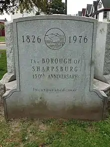 ![]() Memorial celebrating the 150th Anniversary of James Sharp settling Sharpsburg. |