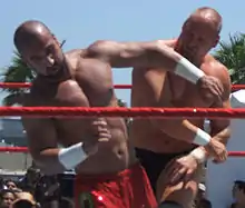 Daivari signed a contract with World Wrestling Entertainment (WWE) in August 2004[1] and debuted on the December 13 episode of Raw alongside Muhammad Hassan as Khosrow Daivari, later shortened to Daivari.[9] Their gimmick was that of two Arab Americans who were tired of the prejudice and stereotypes they were receiving after the 9/11 attacks. Ironically, Daivari would scream instructions in Persian to Hassan when working as his manager. In the weeks leading up to their debut, the two men would appear on Raw in vignettes promoting their hatred towards "America". In the following weeks, they would back up their words with actions, initiating a feud with Raw announcers Jim Ross and Jerry "The King" Lawler.[10][11] At WrestleMania 21 on April 3, 2005, Daivari and Hassan were involved in an angle with Hulk Hogan.[12] While attacking injured wrestler Eugene, Hogan came to the ring and ejected both men from the ring.
