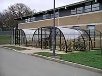• Bike sheds or bicycle sheds usually contain a framework on which bikes can be supported and locked and a roof to keep rain and/or snow off the bikes and their riders while mounting and dismounting. Bike sheds range from little more than a supported roof to more complex structures with walls and locking doors or gates. The color of a bikeshed is the topic of a well-known adage about the challenges of group work in organizational psychology.