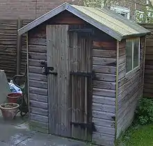 A shed is typically a simple, single-story roofed structure that is used for hobbies, or as a workshop in a back garden or on an allotment. Sheds vary considerably in their size and complexity of construction, from simple open-sided ones designed to cover bicycles or garden items to large wood-framed structures with shingled roofs, windows, and electrical outlets. Sheds used on farms or in the industry can be large structures. The main types of shed construction are metal sheathing over a metal frame, plastic sheathing and frame, all-wood construction (the roof may be asphalt shingled or sheathed in tin), and vinyl-sided sheds built over a wooden frame. Small sheds may include a wooden or plastic floor, while more permanent ones may be built on a concrete pad or foundation. Sheds may be lockable to deter theft or entry by children, domestic animals, wildlife, etc.[1]