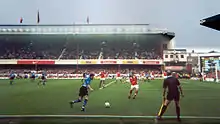 On 15 April 1989, at an FA Cup semi-final between Liverpool and Nottingham Forest, 94 Liverpool fans (later increasing to 97) were crushed to death after the terraces at the Leppings Lane end of the ground became overcrowded, in what became known as the Hillsborough disaster. The following report concluded that the root cause of the disaster was the failure of local police to adequately manage the crowds.[61][62] A memorial to the victims of the disaster stands outside Hillsborough's South Stand, near the main entrance on Parkside Road. After many years of dispute about the facts, in June 2017 six men responsible for safety were charged with criminal offences including manslaughter and misconduct in public office.[63]