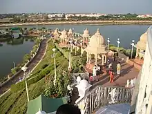 Shegaon has a tourist attraction called "Anand Sagar". The project's budget is ₹300 crore (3 billion rupees).[8][9] Anand Sagar was developed in 2005 by Shri Gajanan Maharaj Mandir Trust on about 140 hectares (350 acres) of land. it is a spiritual and entertainment centre for pilgrims, build around a Dhyan Mandir. There is a 9–11-metre-high (30–35 ft) statue of Swami Vivekananda above a meditation cell at the centre of the water reservoir. It is a replica of Vivekananda Kendra at Kanyakumari. There is an Amphitheatre which seats 3,500 people, used to organize cultural activities, functions, and exhibitions.[10] The water reservoir being developed is anticipated to meet existing and proposed needs of the Sansthan.