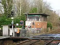 In 1960 the signal box was replaced by a new one on the opposite side of the line, but after this a decline set in. From 1963 the line was transferred to the Western Region, and in that year the Reshaping of British Railways report was published. The smaller stations were soon closed, and most trains beyond Exeter St Davids were diverted to other routes. The gas works had stopped receiving coal in 1957 and all goods traffic was stopped from 18 April 1966. On 7 May 1967[1] the 21 miles (34 km)[2] to Chard Junction was reduced to single track, but this proved a mistake and the double track was restored as far as Yeovil Junction on 1 October. The signal box was closed on 4 January 1970 when the level crossing was converted to lifting barriers which were for many years controlled by a member of staff from a panel at the end of the eastbound platform.[1] In March 2012 a modern signalling system for the Salisbury-Exeter line was commissioned and the line, including crossings, is now controlled remotely by the Basingstoke Rail Operating Centre.[3] Remote control of the crossing eliminated the need for constant staff presence at the station during train operating hours, allowing South West Trains to reduce the hours of ticket office staffing.[4]
