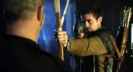 However, Little John's wife Alice is next to face the Sheriff's wrath. Little John is determined to save her by handing over Robin, but Robin convinces John to free him instead. Robin advances and shoots the shears in two with incredible accuracy, but is then forced to surrender. As Robin is hauled off to Nottingham Castle, both gangs believe him to be as good as dead, apart from Much. Robin is interrogated by the Sheriff, who calls him a coward for not taking the opportunity to kill him.