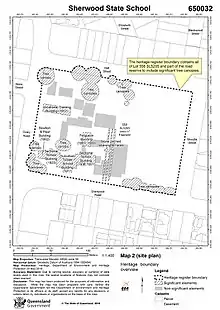 - ↑ DPW, "Sherwood State School, Layout of Fittings etc. & Drainage", Drawing 78-410A, 24 October 1951