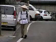 Henro (遍路) is the Japanese word for pilgrim,[5] and the locals along the route address the pilgrims as o-henro-san (お遍路さん). They are often recognizable by their white clothing, sedge hats, and kongō-zue or walking sticks. Alms or osettai (お接待) are frequently given to pilgrims by Shikoku's residents.