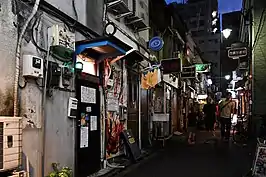 Shinjuku Golden Gai (Japanese: 新宿ゴールデン街, Hepburn: Shinjuku gōruden-gai) is a district of Kabukicho within Shinjuku, a special ward of Tokyo, Japan.[1] It is composed of a network of six narrow alleys, connected by even narrower passageways which are about wide enough for a single person to pass through. Over 200 tiny shanty-style bars, clubs and eateries[2] are squeezed into this area.