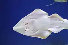 The shovelnose guitarfish, Pseudobatos productus, is a ray in the family Rhinobatidae.[2][3] It becomes mature at an estimated seven to eight years old. Males are between 90–100 cm (35–39 in) long, while females are around 99 cm (39 in) at that age.[4] The ray can live up to 11 years, and full-grown sizes are around 120 cm (47 in) for males, and females reach 137 cm (54 in).[5] They range from central California south to the Gulf of California.[1] Morphological and genetic variations occur in the mitochondrial DNA in those found in the Gulf of California, evidencing their isolation from the rest. Because of this, the conservation of this species must be carefully managed to preserve the biological diversity.[6] The shovelnose is considered to be a primitively developed ray, with many features of both sharks and rays.
