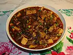 Mapo doufu | ![]() | 麻婆豆腐 | 麻婆豆腐 | mápó dòufǔ | Literally "pockmarked Ma's tofu". Spicy sauce similar to yuxiang ("in the style of fish") sauce.[16] |