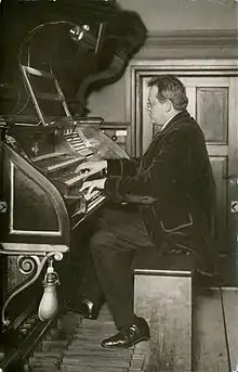 ![]() Reger playing the Sauer organ in the Leipzig Conservatory in 1908 | |