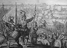 Ostend was resupplied via the sea and as a result held out for three years.[11] A garrison did a tour of duty before being replaced by fresh troops, normally 3,000 at a time keeping casualties and disease to a minimum.[12] The siege consisted of a number of assaults by the Spanish, including a massive unsuccessful assault by 10,000 Spanish infantry in January 1602 when governed by Vere.[13] After suffering heavy losses, the Spanish replaced the Archduke with Ambrosio Spinola and the siege settled down to one of attrition with the strong points gradually being taken one at a time.[4]