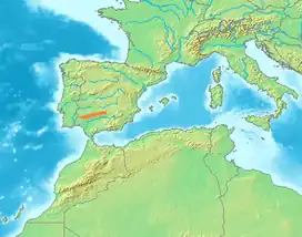 The Sierra Morena stretches for 450 km in an E-W direction from the high course of the Guadalmena River in the Sierra del Relumbrar until northwestern Huelva Province, extending into Portugal. The system is the result of the uplift produced by the pressure of the northward-moving African Plate.[5] It is made up of hard Paleozoic rocks such as granite and quartzite, as well as softer materials such as slate and gneiss.