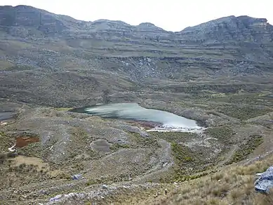 The Sierra Nevada del Cocuy region corresponds to the highest elevations of the Eastern Cordillera of the Colombian Andes. The geologic origins of this mountain range are complex, but have been hypothesized to be the inversion of a Mesozoic extensional basin which gave way to a sedimentary basin that accumulated sediments for millions of years before its closure in the Paleogene.[5][6] The inversion and resulting shortening and compression values have been estimated to be in the order of 60 ± 20 km.[7][8] Additionally, it has been proposed that the relatively high topography of the Eastern Cordillera of the Colombian Andes around these areas is due to flat slab subduction of the Nazca plate under the South American plate for ~7.5 Million years .[9]