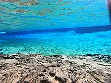 Scuba diving and snorkeling in Silfra are popular because of its clear water and location within the continental rift.[6] Silfra is about a 45 to 60-minute drive east of Iceland's capital Reykjavik. There are three main dive sites: Silfra Hall, Silfra Cathedral, and Silfra Lagoon. The Silfra Hall consists of multiple cave systems underwater with a maximum depth of about 45 metres.[7]The Cathedral is a 100 metres (330 ft) long fissure with visibility almost from end to end.[8] Shallow at the entry points and the ends of the fissure, Silfra descends to a maximum depth of 63 metres (207 ft) but diving to this depth is seldom done as it requires technical diving skills. To get to the main part of Silfra from the caves, divers must go down through the "toilet" headfirst which is a narrow tunnel to a depth of 16 metres. It is the only opening from the Silfra cave to the Silfra crack for the water to go through, thus creating a strong current that flushes every diver straight down.[7] Although this practice is no longer allowed due to the instability of the tunnel, it still holds importance because it is the entrance to the cave. Towards the end of the fissure, it opens up to a shallow lagoon with the most visibility covered in green algae. It is about 120 metres (390 ft) long and is used as the exit point for divers and snorkelers.[9] The water temperature is between 2–4 °C (36–39 °F) but can be comfortably dived using a dry suit.[10]