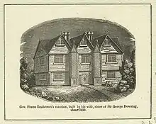 Simon Bradstreet was baptized on March 18, 1603/4[1] in Horbling, Lincolnshire, the second of three sons of Simon and Margaret Bradstreet. His father was the rector of the parish church, and was descended from minor Irish nobility.[3] His grand nephew via his brother John Bradstreet was to become Sir Simon Bradstreet, 1st Baronet.[4] With his father a vocal Nonconformist, the young Simon acquired his Puritan religious views early in life.[5] At the age of 16, Bradstreet entered Emmanuel College, Cambridge. He studied there for two years,[6] before entering the service of the Earl of Lincoln as an assistant to Thomas Dudley in 1622.[7] There is some uncertainty about whether Bradstreet returned to Emmanuel College in 1623–1624. According to Venn, a Simon Bradstreet attended Emmanuel during this time, receiving an M.A. degree,[6] but genealogist Robert Anderson is of the opinion that this was not the same individual.[8] During one of Bradstreet's stints at Emmanuel he was recommended by John Preston as a tutor or governor to Lord Rich, son of the Earl of Warwick.[7] Rich would have been 12 in 1623, and Preston was named Emmanuel's master in 1622.[9][10]