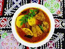 Sindhi cuisine (Sindhi: سنڌي کاڌا) refers to the distinct native cuisine of the Sindhi people from Sindh, Pakistan. Sindhi cuisine has been influenced by Central Asian, Iranian, Mughal food traditions.[1] It is mostly a non-vegetarian cuisine,[2] with even Sindhi Hindus widely accepting of meat consumption.[3] The daily food in most Sindhi households consists of wheat-based flat-bread (phulka) and rice accompanied by two dishes, one gravy and one dry with curd, papad or pickle. Freshwater fish and a wide variety of vegetables are usually used in Sindhi cuisine.[4] Restaurants specializing in Sindhi cuisine are rare, although it is found at truck stops in rural areas of Sindh province, and in a few restaurants in urban Sindh.[5]