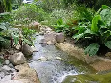 Tropical plants line the bank of the Saraca Stream as it meanders its way down a small hill. The main highlights of the stream walk are the Yellow Saraca trees (Saraca cauliflora) and Red Saraca (Saraca declinata). Other attractions include the Palm Valley, Bandstand area, Sun Garden and Sundial Garden.