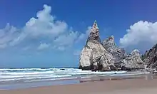 The São João platform, along the northern flank of the Sintra Mountains, has altitudes between 100 metres (110 yd) and 150 metres (160 yd), while the southern part of the mountains, the Cascais platform, is lower: sloping from 150 metres (160 yd) to the sea, terminating along the coast, around 30 metres (33 yd) above sea level.[22][23] The spectacular relief results from the east–west orientation of the massif's axis, its terminus at the coast, and the nature of igneous rocks, which are resistant to erosion.[23] The Eruptive Massif of Sintra (MES) is a dome structure, formed by layers of sedimentary rocks (limestones and sandstones) from the Upper Jurassic and early Cretaceous periods.[23] A metamorphosed igneous intrusion resulted in a narrow halo of metamorphic rocks, but also strongly deformed these sedimentary layers causing a vertical exposure.[23] While in the south there are enclosed sedimentary layers, to the north (around Praia Grande) the massif is steep. The sedimentary formations, until the beginning of the Upper Cretaceous, are deformed by the intrusion which limits the MES to the end the Cretaceous.[23] Radiometric aging of different rocks from the massif has indicated an age between 80 and 75 million years (confirming the installation of the massive Upper Cretaceous).[23]