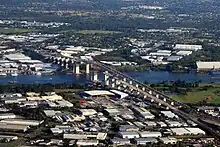 The Sir Leo Hielscher Bridges, formerly and still commonly known as the Gateway Bridge, are a side-by-side pair of road bridges on the Gateway Motorway (M1), which skirts the eastern suburbs of Brisbane, Queensland, Australia. The western bridge carries traffic to the north and the eastern bridge carries traffic to the south. They are the most eastern crossings of the Brisbane River and the closest to Moreton Bay, crossing at the Quarries Reach and linking the suburbs of Eagle Farm and Murarrie. The original western bridge (formerly named the Gateway Bridge) was opened on 11 January 1986 and cost A$92 million to build.[1][3] The duplicate bridge was opened in May 2010, and cost $350 million.[1]