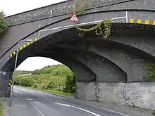 A smaller and less extremely skewed example is Hereford Road bridge in Ledbury, Herefordshire, which was built in 1881 to carry the Ledbury and Gloucester Railway at an angle of approximately 45° across the Hereford Road, now a section of the A438.[73] The railway having closed in 1959,[74] it is now used as part of a footpath.[75]