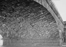 The ribbed skew arch is a form of the false skew arch in which several narrow regular arches or ribs, offset laterally with respect to one another, are used to approximate a true skew arch.[66] Motivated by the lack of skilled stonemasons in the 18th century United States, the design was first proposed in 1802 for a crossing of the Schuylkill River in Philadelphia by British-born American architect Benjamin Henry Latrobe[67] and later championed by French civil engineer A. Boucher.[68] Because the series of arch ribs are all regular arches this method of construction has the advantage of being less demanding of unskilled artisans but it has received considerable criticism as being weak, susceptible to frost damage, ugly and wasteful of materials.[69] Although Latrobe's bridge was never built as proposed, his method of construction was later to be used extensively by the Philadelphia and Reading Railroad throughout the Philadelphia area, including an ambitious viaduct designed by Gustavus A. Nicolls with six skewed spans of 70 feet (21 m) across the river and six more land-based skew arches, which was built close to the site of Latrobe's proposed bridge and completed in 1856.[70] Thanks to the reinforcing of the spandrel walls in 1935, the bridge continues to carry rail traffic to this day.[67]