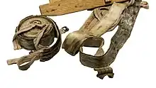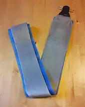 Climbing skins are strips that attach to the bottom of Nordic, alpine touring or randonnée skis to help while ascending backcountry slopes. They are designed to be removed for skiing downhill. They are typically attached to the skis via a loop on the ski tip, a hook on the tail, and adhesive on the base of the skin. They are called skins because they resemble sealskin, from which the first ski skins were made.[1] They are typically made from nylon or mohair or a combination thereof, and are designed to let the ski slide forward on snow but not backward.[2][3] They are usually narrower than the ski to allow the ski edges to get a grip. Some ski resorts permit skinning.[4][5]