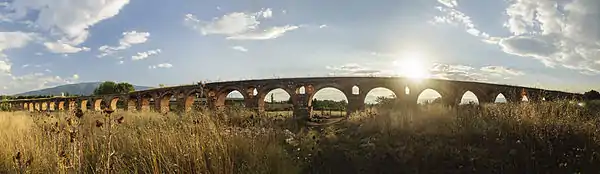 The Skopje Aqueduct (Macedonian: Скопски аквадукт) is an aqueduct and archaeological site located in the neighbourhood of Vizbegovo 2 km (1.2 mi) northwest of central Skopje, North Macedonia. The Skopje Aqueduct is the only aqueduct in Macedonia, and one of three largest and well preserved in the former Yugoslavia along with Diocletianus Aqueduct near Split, Croatia and Bar Aqueduct in Montenegro.