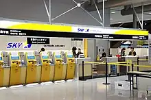 Skymark Airlines Inc. (スカイマーク株式会社, Sukaimāku Kabushiki-gaisha) (TYO: 9204) is an airline of Japan headquartered at Haneda Airport in Ōta, Tokyo, Japan.[3] It operates scheduled services with a main base at Haneda Airport with another base at Kobe Airport where it is the dominant carrier.[4] It also operates a base at Naha Airport. It is the only Japanese airline offering regular scheduled services at Ibaraki Airport north of Tokyo.